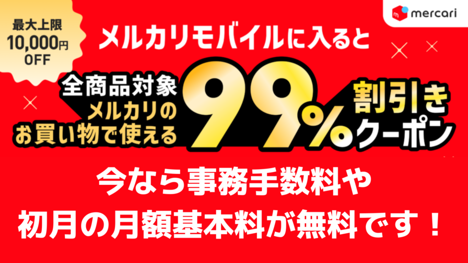対象期間内に申し込み・審査・開通を完了すると、メルカリで使える99%OFFクーポンに加えて、初月の料金が無料になる特典が受けられます。