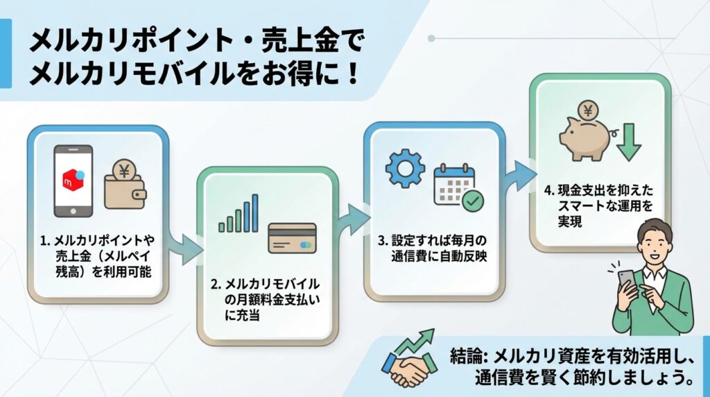 さらに、メルカリでの取引によって貯まったポイントや売上金(メルペイ残高)を、メルカリモバイルの料金支払いに充てることも可能です。設定を行えば、毎月の通信費に自動で反映させることができ、現金の支出を抑えた運用ができます。
